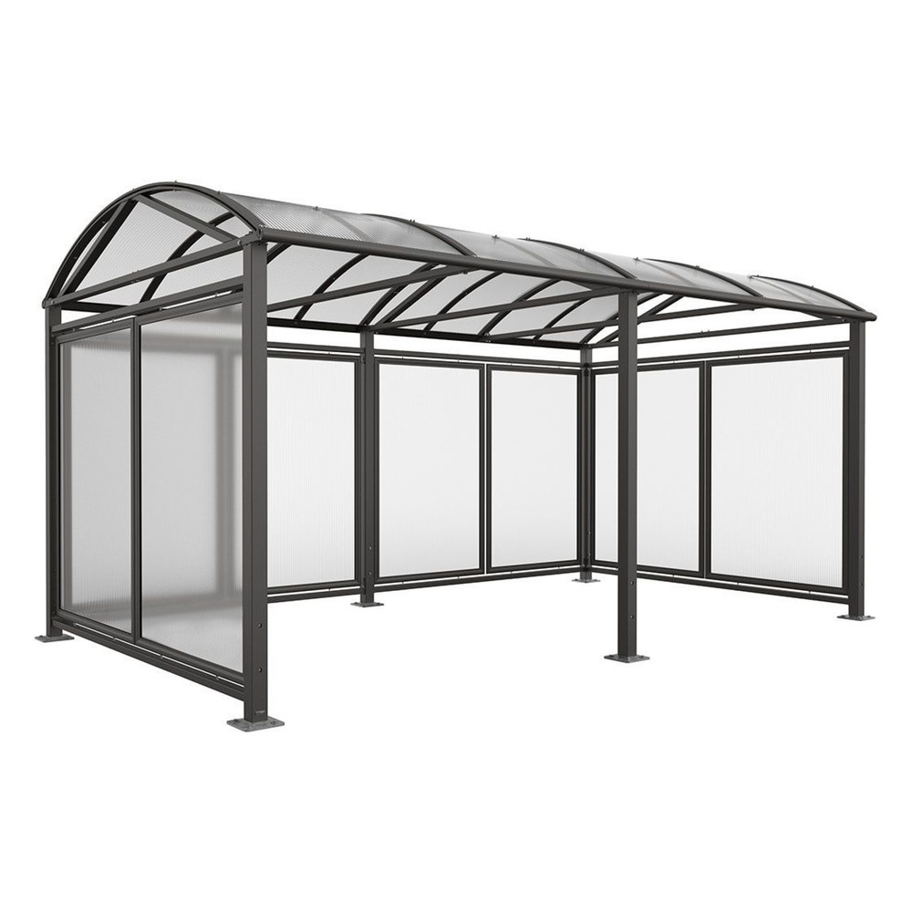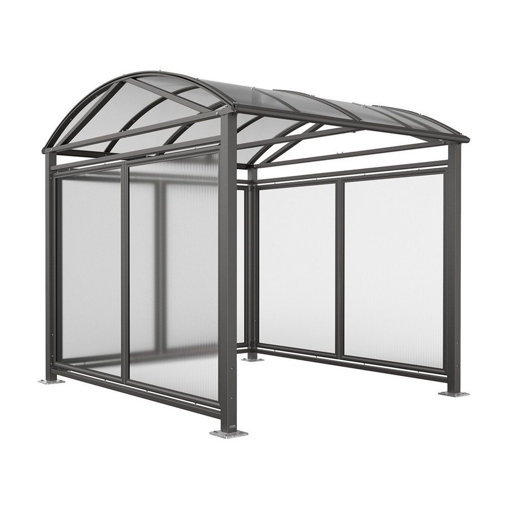 - Dach: Stahlträger 60 x 40 mm, Regenrinne aus Aluminium, Bogendach aus durchsichtigem und UV-geschütztem 10 mm Polycarbonat, seitlich verstärkt gegen Diebstahl und Vandalismus