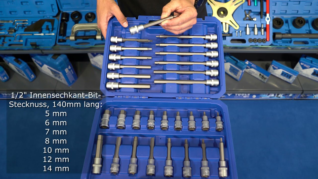 Die insgesamt 30 metrischen Innensechskant-Bit-Stecknüssse haben Schlüsselweiten von 5 mm - 19 mm. Die Oberfläche ist matt verchromt.