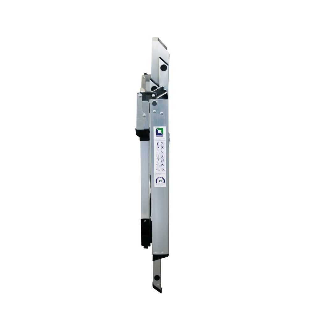 Die 205 mm tiefen Stufen machen die Klappleiter zu einem besonders komfortablen Arbeitsgerät. Eine Anti-Rutsch-Riffelung sorgt für Trittsicherheit. Dank des Grundgestells aus kräftigen Doppelholmen erweist sich die Aluminium-Konstruktion mit 150 kg Tragkraft als äußerst robust.