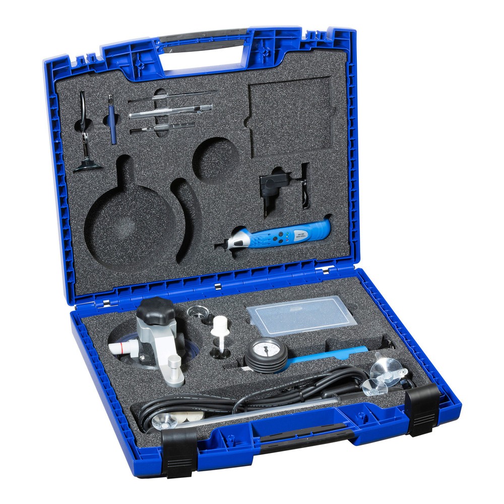 Reparatursystem zur Verbundglasreparatur im praktischen Koffer. Mit allen Werkzeugen, die für eine professionelle Reparatur von kleinen bis hin zu großen Schäden an Nfz- und Pkw-Verbundglasscheiben nötig sind. Der zur Reparatur erforderliche Über- und Unterdruck wird durch eine Druck-/Unterdruckpumpe erzeugt. Der einfache Aufbau des Systems gewährleistet eine sichere, mühelose Bedienung. Dank des hochwertigen, extrem dünnflüssigen Reparaturharzes werden auch feinste Risse zuverlässig aufgefüllt. Selbst Steinschlagschäden mit Zertrümmerungen an der Oberfläche oder mit stark verschmutztem Einschlagpunkt können damit erstklassig repariert werden, da eine Akku-Minibohrmaschine zum Aufbohren des Einschlagpunktes enthalten ist. Die Dichtung der großen Harzkammer hat einen Innendurchmesser von 9,5 mm und ist für große Steinschläge wie sie baulich bedingt an Lkw und Bussen häufig vorkommen, geeignet. Auch für Steinschläge mit zwei nah beieinander liegenden Einschlagpunkten ist die große Harzkammer ideal. Sie ist so konstruiert, dass sie an flachen und steil stehenden Scheiben gleichermaßen verwendet werden kann. Der 125 mm große Sauger der Basis wird mit der eingebauten Vakuumpumpe mit nur wenigen Pumpstößen sicher befestigt. Der stabile Leichtmetallarm ist verschieb- und schwenkbar, so dass die Harzkammer mühelos und exakt über der Einschlagstelle positioniert werden kann.