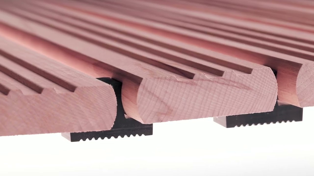 Beim Zerspanen sicher stehen: Yoga Holzrost ohne Auffahrkeile und Abschrägung besteht aus rutschhemmend gerieften Buchenholz-Leisten.