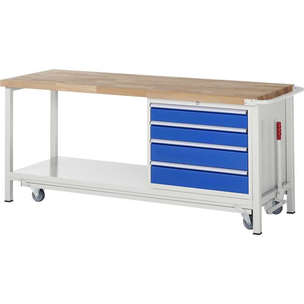 RAU Werkbank Serie 8000 mit absenkbarem Fahrgestell, 1 Container, 1 Ablageboden, HxBxT 880 x 2.000 x 700 mm, 4 x 90%-Auszug-Schubladen, Breite 680 mm