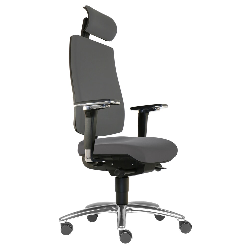 Die multifunktionale Synchron-Mechanik des Drehstuhls fördert dynamisches Sitzen, indem sowohl der Sitz als auch die Rückenlehne den Körperbewegungen im passenden Winkelverhältnis folgen. Dies unterstützt eine ergonomische Sitzhaltung und steigert das Wohlbefinden während der Arbeit. Die integrierte Lordosenstütze hilft Ihnen, eine aufrechte Sitzhaltung einzunehmen und beugt somit Haltungsschäden vor. Darüber hinaus verfügt der Stuhl über ein orthopädisches Wechselpolsterkonzept zum einfachen werkzeuglosen Austausch der Sitzpolster. Die 5D-Armlehnen sind in Höhe, Breite, Tiefe, Neigung und Rotation verstellbar und entlasten Ihre Schulter- und Nackenmuskulatur. Das chromatierte Aluminium-Fußkreuz verleiht dem Bürostuhl ein edles Aussehen und ist zudem pflegeleicht. Die Universalrollen des Stuhls sind für verschiedene Bodenarten geeignet und verhindern das Verkratzen empfindlicher Böden. Sowohl das Sitz- als auch das Rückenpolster bestehen aus hochwertigem und pflegeleichtem Material, das in verschiedenen Farben für unterschiedliche Büroumfelder erhältlich ist.
