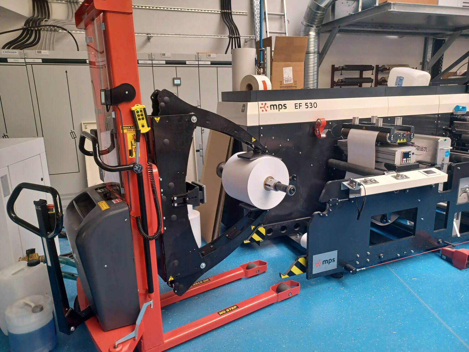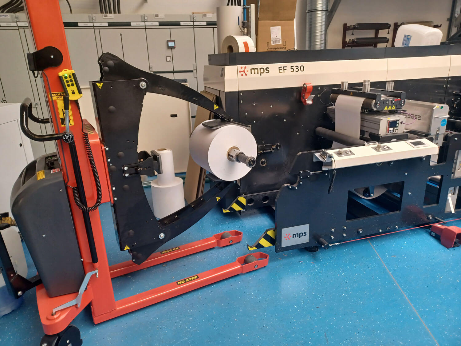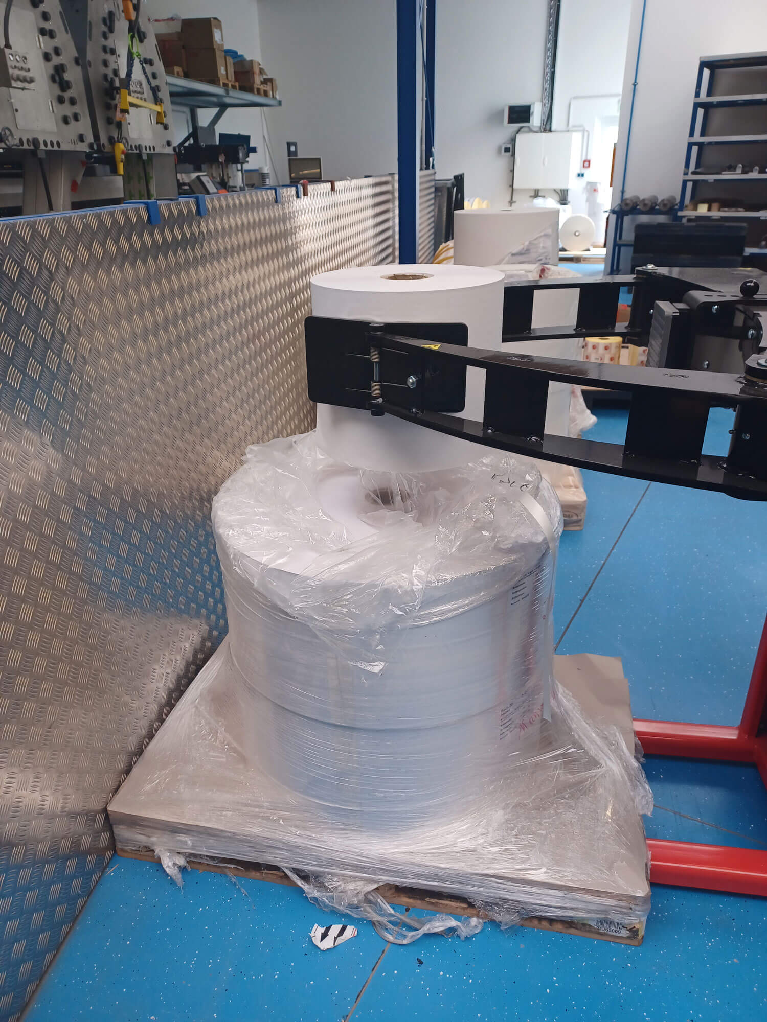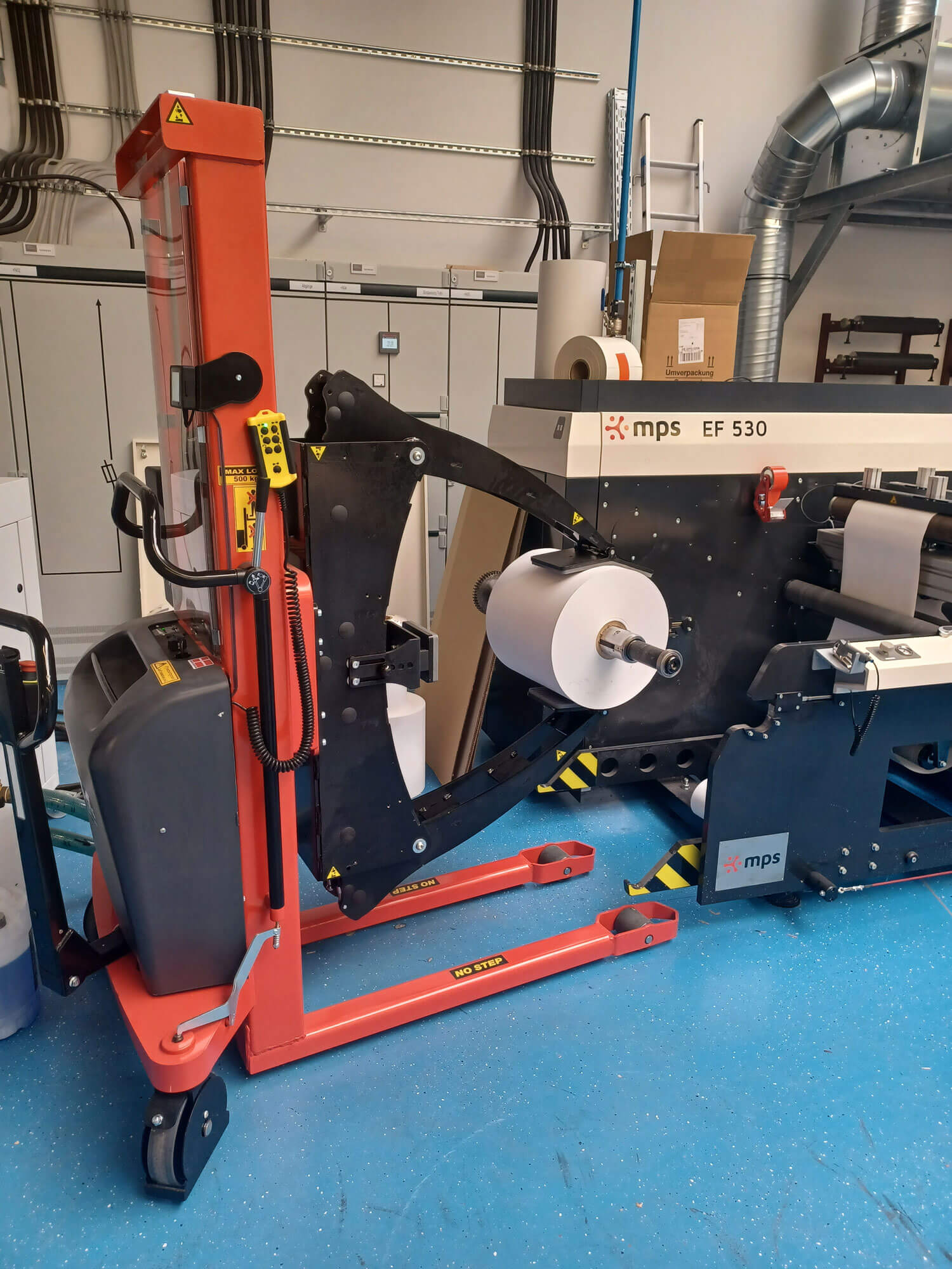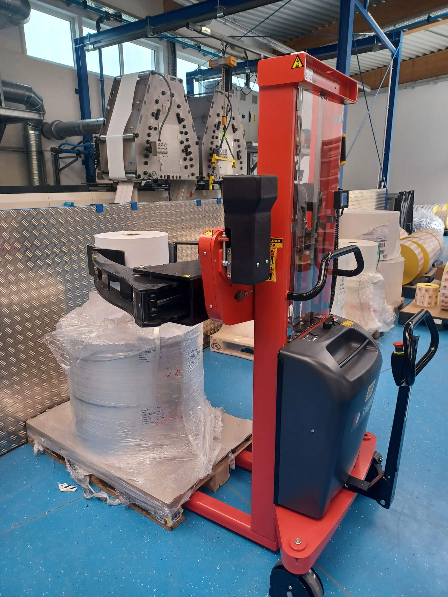 Für Aleithe Haftetiketten in Lutherstadt Wittenberg haben wir eine Lösung entwickelt, um Rollenwaren ergonomisch, sicher und effizient in die Produktionsprozesse einzubringen.