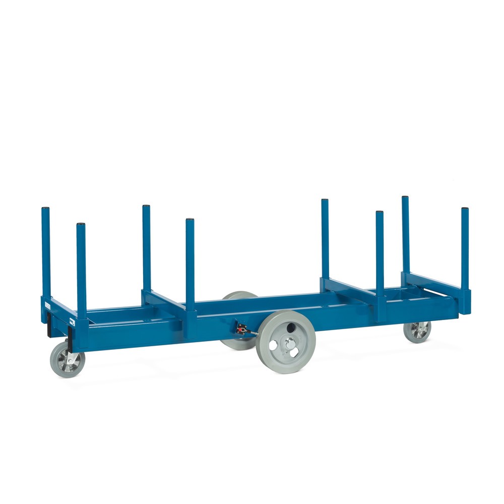 Die bei uns verfügbaren Langmaterialwagen werden von Hand gezogen und angeschoben. Wir führen jedoch auch Varianten als Langmaterialanhänger, die mit einem Elektroschlepper transportiert werden können. Die stabilen Räder und Rollen erleichtern das Verfahren des Langmaterialwagens. Vorn und hinten ist je eine Lenkrolle angebracht. In der Mitte des Wagens befinden sich zwei feststellbare Bockrollen. Bei manchen Modellen sind sie rhombisch angeordnet: Dadurch kann der Wagen auf der Stelle gedreht werden.
