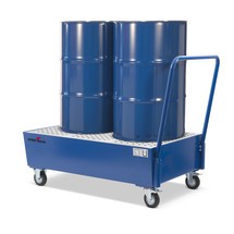 Mittels eines Fahrbügels schieben oder ziehen Sie die Auffangwanne. Durch bewegliche Lenkrollen bleiben diese manövrierbar. Für einen festen Stand können Sie die Fässer zusätzlich mit einem Spanngurt für fahrbare Auffangwannen sichern. |